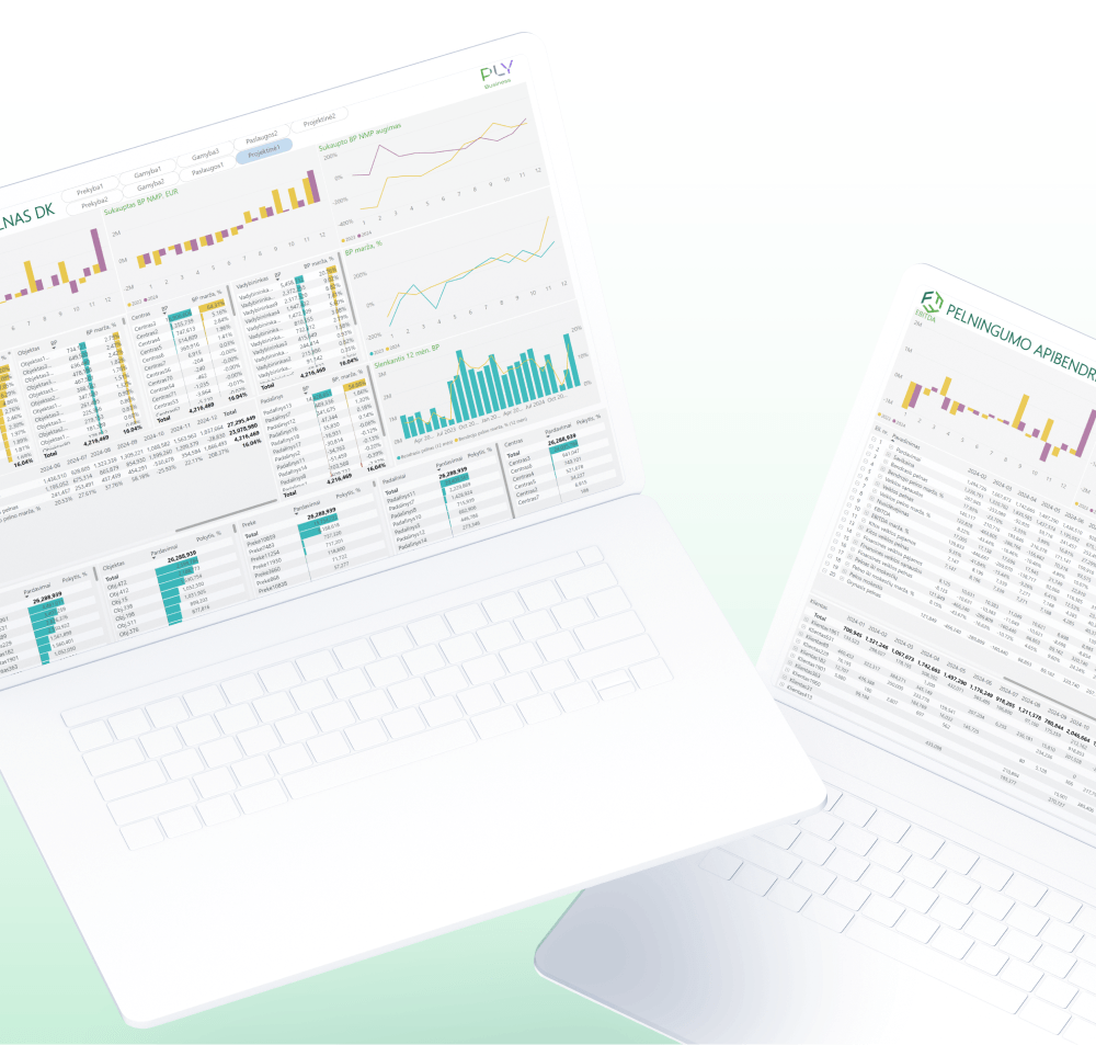 Gaunate daugybę ataskaitų ir duomenų iš savo buhalterio. Gal net turite įdiegtą tam tikrą verslo analitikos (BI) įrankį. Tačiau Jums ir toliau trūksta aiškumo, kontrolės ir įžvalgų, kurios leistų efektyviai valdyti verslą. Todėl mes sukūrėme PLY Business. Tai yra duomenų analitikos sprendimai, kurie yra pritaikyti Jūsų verslo poreikiams. Pagaliau galėsite atsakyti į kiekvieną Jums rūpimą verslo klausimą. Iš karto, o ne rytoj, ar po mėnesio.